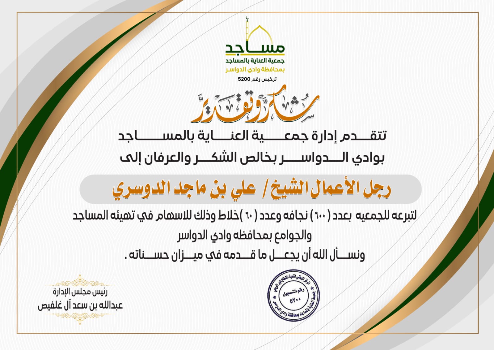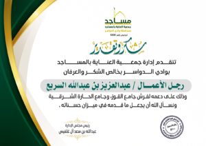 تتقدم إدارة جمعيه العناية بالمساجد بمحافظة وادي الدواسر بخالص الشكر والعرفان إلى رجل الأعمال الشيخ علي بن ماجد الدوسري وذلك لتبرعه بكميه من النجافات والخلاطات وتوزيعها وتركيبها على المساجد والجوامع تحت أشراف جمعيه العناية بالمساجد