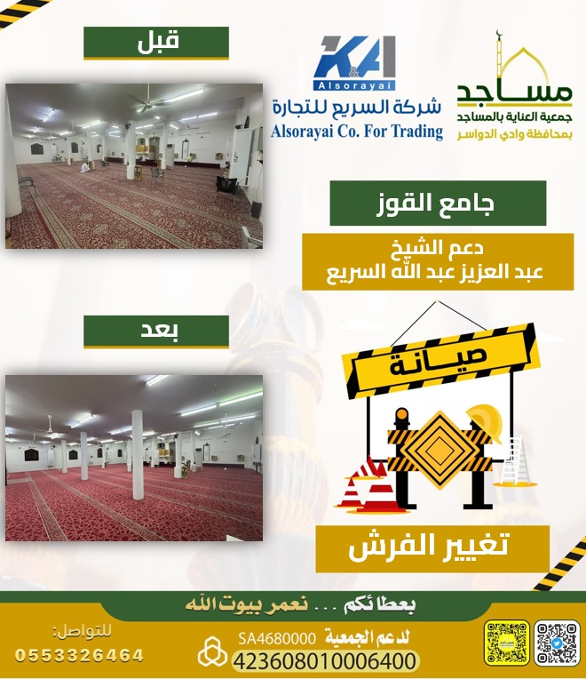 تعلن جمعية العناية بالمساجد بمحافظة وادي الدواسر عن الانتهاء من أعمال فرش جامع القوز، وذلك ضمن جهودها المستمرة في العناية ببيوت الله وتهيئتها للمصلين.