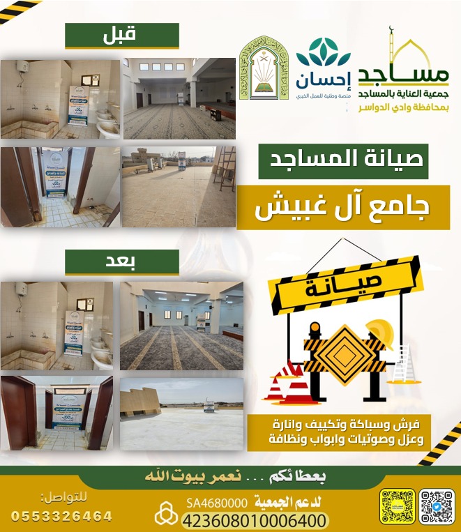 بحمد الله وتوفيقه، أنهت جمعية العناية بالمساجد بمحافظة وادي الدواسر أعمال صيانة جامع آل غبيش بدعم من منصة احسان للعمل الخيري.