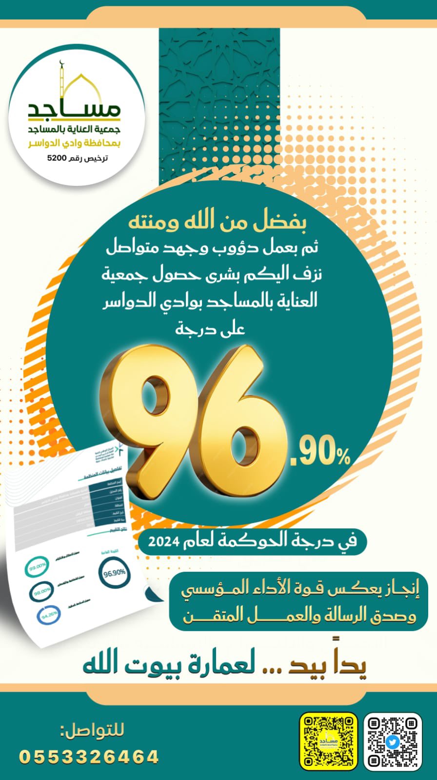بفضلٍ من الله تعالى… حققت جمعية العناية بالمسجد بوادي نسبة 96.90% في تقييم الحوكمة لعام 2024 الصادر عن المركز الوطني لتنمية القطاع غير الربحي.  إنجاز يعكس قوة الأداء المؤسسي وصدق الرسالة، ويؤكد أن خدمة بيوت الله شرفٌ يستحق العمل المتقن والإخلاص.