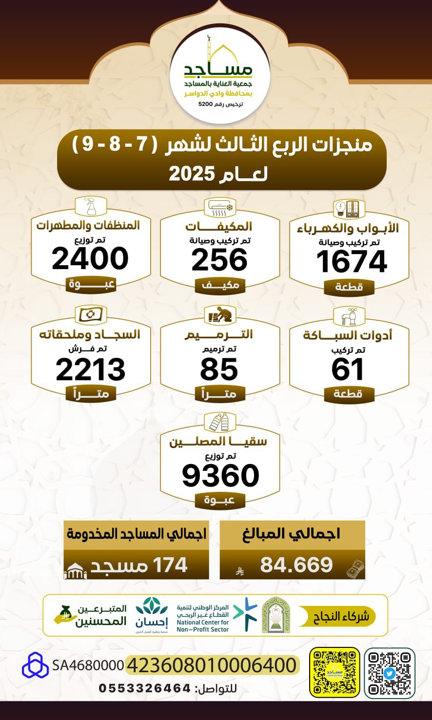جمعية العناية بالمساجد بوادي الدواسر أنهت الجمعية أعمالها للربع الثالث من العام وقامت بتأمين احتياجات عدد من المساجد والجوامع في المحافظة شكراً لكل من ساهم في تحسين وصيانة بيوت الله بدعمكم نواصل العناية ببيوت الله